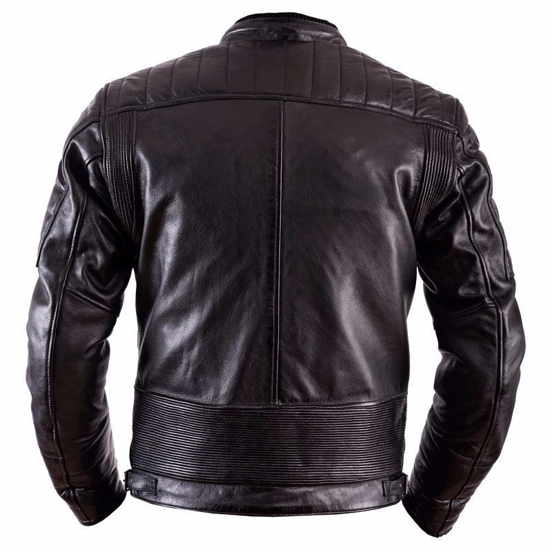 Giubbotto da moto in pelle di bovino (di uno spessore da 0,9 a 1,1 mm), leggero e con un aspetto sgualcito spiegazzato.